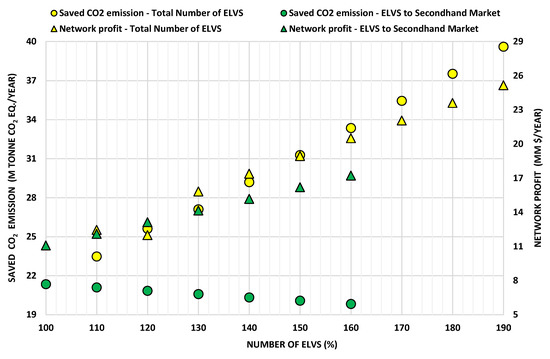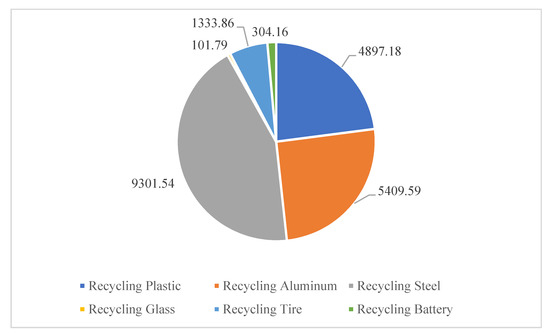 The revenues are obtained are manifested from selling a vehicle’s recycled parts (Equation (15)) and from selling a vehicle’s recycled materials (Equation (16)). The expenses are occur because of disposing of non-recyclable and hazardous materials (Equation (17)). Fixed and variable expenses are associated with the network components (Equation (18)) and transport network expenses (Equation (20)). In this model, CO2 reduction is indirectly accounted for. The use of recycled material instead of virgin materials has a positive impact on the environment. In addition, reducing the transportation cost in the network results in reducing CO2. The results obtained by the model were analyzed using certain indicators, such as CO2 impact, to show the proposed EIP-4-ELVs CO2.