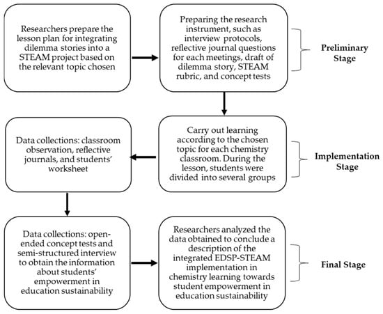 The purpose of this study was to answer the research question: what is the potential of the Ethical Dilemma STEAM Teaching Model to empower Indonesian secondary school students with both chemistry knowledge and transdisciplinary capabilities with which to resolve environmental problems? Thus, the goal was to investigate how well students can respond to this innovative teaching and learning approach. In order to achieve this, the research was designed as an interpretive case study whose constructivist epistemology enables researchers to understand participants’ lived experiences of a social phenomenon [64,65]. Data were collected from semi-structured interviewing, students’ reflective journaling, and extensive classroom observations. The study was conducted in four high schools in Jakarta, with a total of 155 participants, consisting of school A (36 students in grade 10), school B (36 students in grade 11), school C (36 students in grade 11), and school D (47 students in grade 12). Informed consent was obtained from students who volunteered to be involved in data collection and analysis. The research was conducted in three stages—the preliminary stage, the implementation stage, and the final stage—as shown in Figure 1.