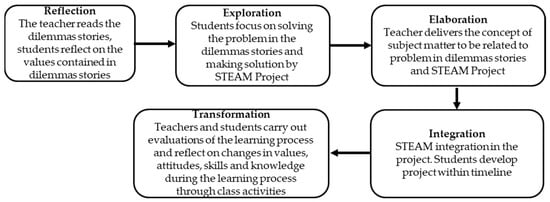 The Ethical Dilemma STEAM Teaching Model was developed by integrating EDSP with a STEAM education project. EDSP is a pedagogical method designed to engage students in values-based, transformative learning by using ethical dilemma stories [5]. Ethically confusing issues force students to engage in reflective and critical thinking to find appropriate solutions [44,45]. The process of reflection and interaction with peers enables students to change by adapting existing values and building new values [4]. EDSP actively transforms learners by encouraging them to think about their pre-existing beliefs and biases and promoting their active participation in self-reflection and social-emotional learning by proposing relevant solutions [4]. In this study, students were encouraged to construct their values through the medium of ethical dilemma stories told by the teachers who played a vital role as facilitators rather than imposing their own values. A basic assumption of EDSP, as a constructivist learning style [46], is that the learning process becomes a reference for values-based learning based on Piaget’s constructivist theory that values cannot be taught explicitly but must be developed by the students.