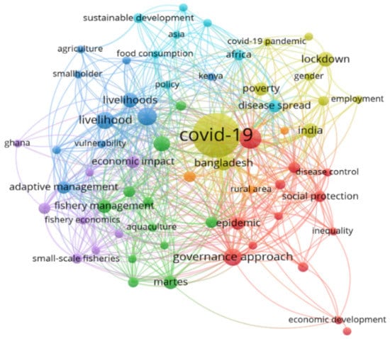 Although research has been carried out on the various household shocks, the COVID-19 pandemic is a new public health shock. Even though COVID-19 is new, we conducted a systematic literature review in October 2021 using bibliographic records in the Scopus database; under filtering, the keyword “COVID-19” screened 283,344 documents published between 2019–2021. After refining the subject area to “social science and economics and econometrics and finance”, the type of the document to “research article”, and the language to “English only”, 2295 documents remained. The keyword “livelihood” was added to further narrow the search to be in line with our research objective, resulting in 135 research articles. “COVID-19”, “livelihoods”, “governance”, and “lockdown” were the most repeated keywords (Figure 1). The United States of America led the number of publications related to COVID-19, followed by India, the United Kingdom, and Australia.