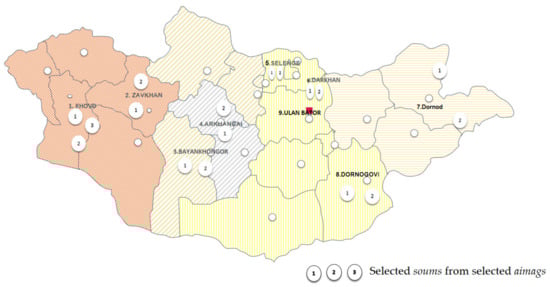 The survey covered 362 households from five different economic regions. Households of 16 soums of eight aimags and six capital city districts are selected (Figure 2).