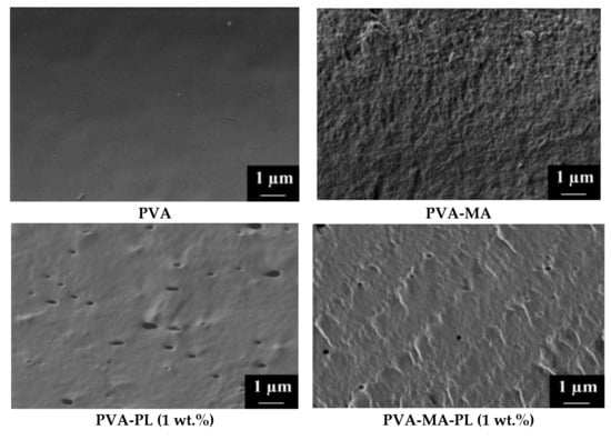 The morphology of dense PVA and PVA-MA membranes modified by Pluronic F127 was investigated using SEM (Figure 5).