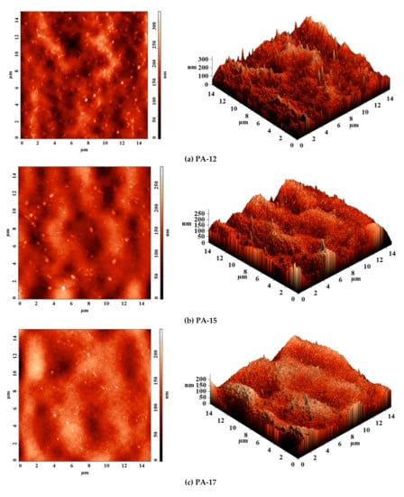 The surface characteristics of the PA membranes (substrates) were detected by AFM. AFM images with a scan size of 15 × 15 µm of PA membranes (substrates) prepared from PA solution of various concentrations (12, 15, 17, and 20 wt.%) are presented in Figure 9.