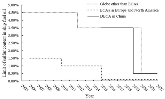 Shipping transport is the backbone of international trade, with international seaborne trade reaching 10.7 billion tons in 2020 [1]. However, as more than 95% of the world’s shipping fleet is powered by diesel engines that use low-quality high-sulfur fossil fuels, the shipping industry produces 13% of global anthropogenic sulfur dioxide (SO2) emissions, which result in at least 80,000 deaths worldwide each year [2]. Due to the significant amount of SO2 emissions from ships caused by high-sulfur fuel oil, sulfur content in marine fuel has started to become regulated globally (see Figure 1). In 2005, the International Maritime Organization (IMO) began enforcing a hard cap of 4.5% sulfur maximum for any marine fuel to decrease sulfur emissions from ships. In 2012, the cap was cut to 3.5%. Then, in 2016, the IMO announced plans to cut the sulfur cap on marine fuel to 0.5%; this 0.5% cap has been in place since 1 January 2020. The same quantity of SO2 emitted in a port or near coastal areas is significantly more harmful than that emitted in the open sea far away from human habitats. Therefore, emission control areas (ECAs) have been established in coastal seas to impose sulfur limits for at-berth ships and ships cruising in coastal waters, which are more stringent than those imposed by the IMO for all ocean-going vessels. The ECAs include the Baltic Sea (in effect since 19 May 2006), the North Sea (in effect since 22 November 2007), and the North American and United States Caribbean Sea areas (in effect since 1 August 2012). The sulfur limit on fuels used by sailing and at-berth ships within the ECAs was reduced from 1.5% to 1.0% on 1 July 2010, and to 0.1% on 1 January 2015. Hong Kong is the first Asian port to require at-berth ships to switch to fuels with a sulfur content of less than 0.5% since 1 July 2015. For simplicity, we refer to fuel with sulfur content not exceeding 0.1% as ultra-low sulfur fuel oil (ULSFO) and fuel with sulfur content not exceeding 0.5% as very-low sulfur fuel oil (VLSFO).