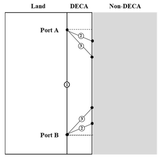 From the perspective of the government, bypassing the DECA is legal but deviates from the original intention of establishing the DECA to reduce the sulfur emissions near coastal areas. This study aims to assist the government in finding the optimal DECA width that can achieve the expected goals among a set of DECA width scenarios. In order to achieve this goal, we need to consider different ship operators’ decisions regarding their ships’ sailing routes and speeds under each scenario, as ships may differ in attributes that can affect their fuel consumption and sulfur emissions. To facilitate our presentation, following the modelling method of Fagerholt et al. [11], we assume that there are several given candidate shipping routes between two ports inside the DECA, including the shortest shipping route along the coastline (which only contains a DECA stretch) and several shipping routes containing both DECA stretches and non-DECA stretches. For a certain ship and a given shipping schedule, the corresponding ship operator determines the optimal sailing route and the optimal sailing speeds in different stretches on the route. For example, as shown in Figure 2, suppose that there are three shipping routes from port A to port B, namely routes 1, 2, and 3. If the ship chooses route 1, it will use ULSFO throughout the voyage. However, if the ship chooses route 2 or 3, which include two DECA stretches and one non-DECA stretch, it will need to switch fuel when leaving and re-entering the DECA. We note that switching fuels requires time, and the time required can vary from a few hours to 3 days, depending on the ship’s condition, the type of fuel and fuel pipe system, and the experience of the operators [2]. During the period that a ship switches from VLSFO to ULSFO to re-enter the DECA, the ship is required to lower the main engine power by slow sailing. Therefore, switching fuels affects the detour behaviors and sailing speeds, and we consider this in our model. In contrast, we do not consider the fuel-switching period when the ship leaves the DECA. The time required to switch to VLSFO after leaving the DECA is much shorter and can thus be ignored [2].