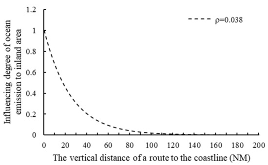 As the vertical distance of the detour route from the coastline increases, the environmental impact of sulfur emissions generated along the route on coastal areas will decrease. By referring to the Multi-scale Atmospheric Transport and Chemistry (MATCH) potency data for Mediterranean Sea and Celtic Sea obtained by Concawe [22], we approximately set . Figure 3 depicts the environmental impact of sulfur emissions generated along a route on the coastal areas when .