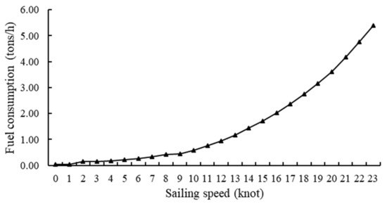 In this subsection, we use a real ship to verify that ships tend to bypass the DECA and switch fuels to save on fuel costs when the width of the DECA is too small. We use a DECA width of 12 NM, in accordance with China’s current policy. Suppose that a container ship named VANCOUVER plans to depart from the Port of Shanghai to the Port of Shenzhen. Part of its configuration information is shown in Table 3. Given the above information, its fuel-switching time is assumed to be 3 h and the sailing speed during fuel switching is set to 15 knots. We use VANCOUVER’s AIS data (204 records) to assess its fuel consumption per hour at different speeds, as shown in Figure 4.