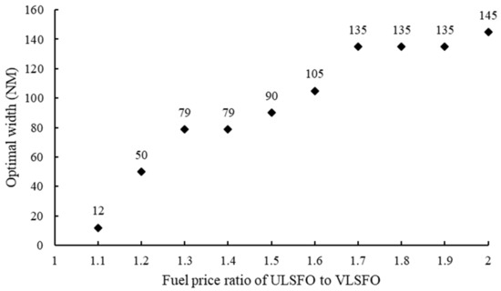 In the previous section, we use a specific container ship, VANCOUVER, to verify that it chooses to bypass the 12-NM-wide DECA. To determine the optimal policy from the government’s perspective, we comprehensively consider the response actions of the 541 sample ships under multiple candidate width scenarios. As stated in Section 4.1, we assume that there are 289 width scenarios, ranging from 12 NM to 300 NM. The first step is to solve the lower-level programming model to find the optimal solutions that capture the responses of the 541 ships with respect to their sailing routes and speeds under each width scenario. The second step is to embed the optimal solution of each ship under each width scenario into the upper-level programming model in order to find the optimal width scenario with the minimum environmental impact on the coastal areas of total seaborne sulfur emissions. Since ship operators’ decisions are highly affected by the fluctuating oil prices, more accurately, by the ratio between ULSFO and VLSFO prices, the lower-level decisions would in turn affect the optimal DECA width for the government. For this reason, we first conduct 10 sets of experiments, which are set according to different ratios of ranging from 1.1 to 2 with 0.1 as an interval. We set the VLSFO price to 480.5 USD/ton, and the final results are shown in Figure 5.