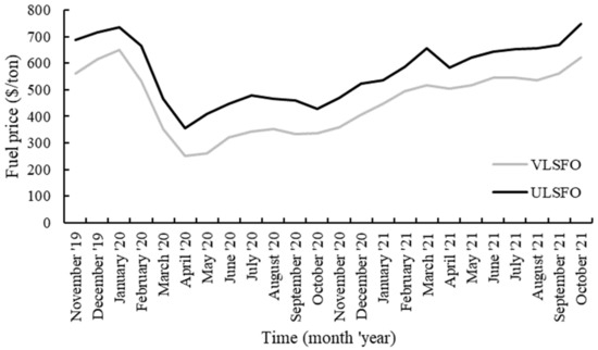 In order to find a more accurate policy recommendation for the Chinese government, we searched corresponding monthly average prices of ULSFO and VLSFO from 1 November 2019, to 1 November 2021, of 20 ports around the world [36], which are shown in Figure 6. We then obtained the average price ratio of ULSFO to VLSFO during this period at about 1.24. The optimal DECA width under this price ratio is 112 NM, which does not fall into the range of 50–79 NM when the price ratio falls into the 1.2–1.3 interval. This result implies that the relationship between the optimal DECA width and the fuel price ratio is not strictly monotonic. This is because our proposed bi-level programming model considers various types of ships and many practical constraints, which can make their relationship intricate. However, we can still suggest that the Chinese government increase the current DECA width to at least 112 NM, which is obtained by using the average value of historical fuel prices.