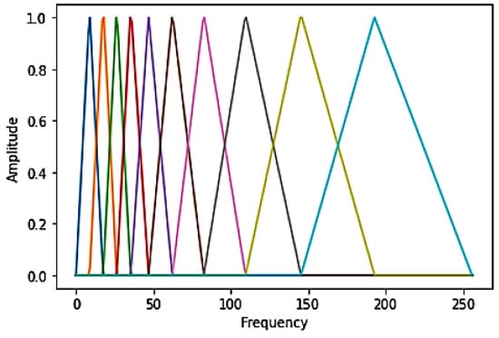 Human sound recognition is more sensitive than a high-frequency band of a low-frequency region of 1000 Hz or less. Therefore, the mel filter bank in Figure 5 is applied because it is necessary to check the low-frequency region more precisely than the high-frequency region. The mel filter bank consists of several filter banks close to the human auditory structure. The center frequency arrangement of each filter is uniform below 1000 Hz and a log scale is applied above 1000 Hz based on the mel unit. Finally, the log-mel spectrum is derived by applying a log-scaled mel filter to the spectrum.