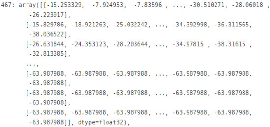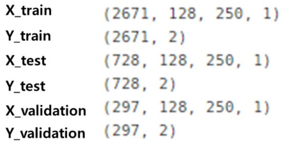 Through the previous process, the training data required for the learning model was extracted to construct a dataset in the form of Figure 13. The total number of datasets is 3696 and each data has the same form (128, 250, 1). The ratio of training data to test data is 8:2 and the verification data is separated by 1:9 of training data. The preprocessed dataset was trained using the 2D CNN-BiLSTM based on the attention mechanism.