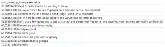 In this paper, an experiment is conducted based on the voice and text data of the DAIC-WOZ dataset. The voice data are classified in the form of “Speaker ID_AUDIO” as shown in Figure 8. One audio file contains conversation information between the interrogator “Ellie” and the experiment participant “Participant.” Text data consist of “start_time”, “stop_time,” “speaker”, and “value”, as shown in Figure 9. The elements “start_time” and “stop_time” are the time from the start time to the end of the speech in the voice file and are expressed in seconds up to the third decimal place; “speaker” is a column that distinguishes each speaker and consists of “Ellie” and “Participant”; “value” is the dialogue sentence information between “Ellie” and “Participant.”