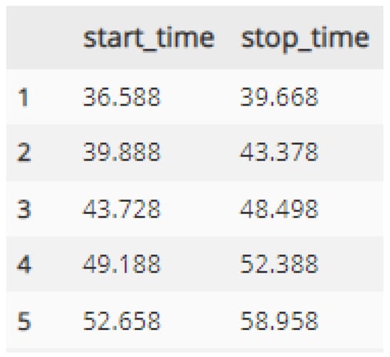 As in the text data, voice data are a mixture of the virtual announcer and subject data. Since this system only uses the subject’s voice data provided in the dataset, as shown in Figure 11, start_time and stop_time for each sentence are used to separate out the subject’s voice data.