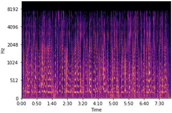 The voice data that contain only the subject’s voice are separated and converted into a log-mel spectrogram through the Librosa library and the log-mel spectrogram is cut to voice length using Equation (2). Figure 12 of the log-mel spectrogram contains the subject’s overall speech information.
