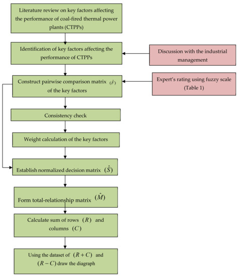 Though, to address the issues concerned with CO2, the transition towards dependence on renewable energy sources is inevitable; the complete transition seems impossible. Various factors act as impendence to the transition towards renewable energy sources, for instance, when solar power is considered; first, it is not possible to receive the optimum level of required energy, and receiving sunlight throughout the year is not possible. Apart from this natural impendence, the high initial setup and maintenance costs, technological void, and feasibility keep the transition towards renewable energy sources an uphill task. In addition to extending support to this fact, a study by Ghimire and Kim [46] in analyzing the barriers to renewable energy development in Nepal, identified problems at the economic and policy levels as the major hindrance in the transition. These barriers are not only limited to developing economics; even in developed economies, such as Australia, the situation remains the same [47]. The deployment of other renewable energy sources, such as wind energy, hydro energy, and tidal energy, are also in the same situation [48]. Additionally, it should be sensed that it is impossible to meet all the needs of renewable energy sources. Hence, a blend of conventional and renewable energy sources should also be used to meet the energy demand and SDGs [49]. The necessity of moving towards renewable energy resources arises only due to a series of concerns regarding conventional energy sources, especially coal-based energy production. The major concern with coal-based energy production is CO2 emission and poor performance efficiency. Many factors affect the performance of the CTPPs, which results in poor performance efficiency and high CO2 emission. Taking this into consideration, this study attempts to identify various factors that reduce the performance efficiency of thermal power plants with increased CO2 emission. Next, an integrated approach of FAHP and FDEMATEL is used to prioritize and uncover the relationship between the factors affecting the thermal power plant’s performance. The application of FAHP and FDEMATEL in evaluating the factors is shown in Figure 1 and explained as follows: