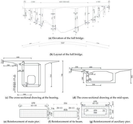 The span arrangement of the prototype CHRF bridge was 3 × 30 + 66 + 130 + 66 + 4 × 30 m (shown in Figure 1a). The radius of curvature of the bridge was 650 m (shown in Figure 1b). The main beam of the bridge was a single continuous box girder with a variable cross-section. The cross-section height was 7.0 m near the pier-beam consolidation and 2.8 m at the middle section (shown in Figure 1c,d). The cross-section width was 12.0 m at the top and 6 m at the bottom. The concrete strength of the main girder was C55. The main substructure of the bridge was a double-limbed thin-walled pier (the longitudinal and transverse sizes of the pier were 6500 mm × 1900 mm) (shown in Figure 1e), the longitudinal and transverse sizes of the tie beam were 5500 mm × 1900 mm (shown in Figure 1f). The side substructure of the bridge was a double-limbed thin-walled rectangular hollow pier (the longitudinal and transverse sizes of the pier were 6500 mm × 2600 mm) (shown in Figure 1g), and the concrete strength of the substructure was C40. The adjacent bridge was a continuous beam bridge. The substructure of the adjacent bridge was rectangular hollow piers. The longitudinal reinforcement of the substructure was HRB335, and the stirrup of the substructure was HRB300. The bearing systems of the bridge were all basin-type rubber bearings. The expansion joints were arranged between the main bridge and adjacent bridge, bridgeheads, and embankment of the adjacent bridge. The gap size of the expansion joints between the main bridge and the adjacent bridge was 240 mm.