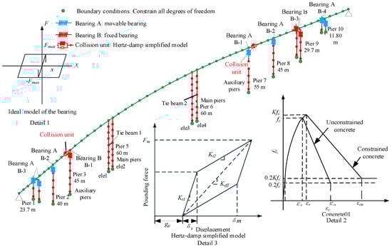 The main beam of the bridge generally does not enter the plastic state during dynamic analysis. The elastic beam-column elements were selected to construct the main beam of the bridge. The main girder had 270 nodes and 269 elements. Nonlinear beam-column fiber elements were selected to model the piers and tie beams. The cross-sections of the piers and tie beams were composed of three types of fibers: unconstrained concrete, constrained concrete, and steel bars. Concrete 01 was used to model the concrete (Figure 2, Detail 2). Steel 02 was used to model the reinforcement. The material properties of reinforcement and concrete in the model are shown in Table 1. The bearing was simulated using zero-length elements, and its constitutive model was a bilinear hysteretic model. In addition, a pounding element was set at the expansion joints of the bridge to simulate the pounding between the main bridge and adjacent bridges at the expansion joints. The constitutive model of the pounding element was the Hertz-damp model. A finite element model of the full-bridge is shown in Figure 2. Newmark-beta method was chosen to solve the equation of motion for dynamic analysis in OpenSees 3.3.0. The parameters of the Newmark-beta were selected as γ = 0.5, β = 0.25.