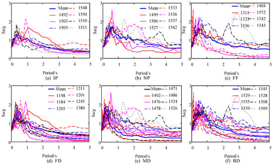 To analyze the dynamic response of a CHRF bridge under different NFGMs, we selected 42 ground motions from the latest database of the PEER NGA-West 2, including near-fault impulse ground motions (IPGM), near-fault non-pulse ground motions (NPGM), and far-fault ground motions (FFGM), which were selected as the input ground motions to consider the pulse impact on the dynamic response of the CHRF bridge. Furthermore, NFGMs in the forward region (FR), in the middle region (MR), and in the backward region (BR) were also selected as the input to consider the directional effect on the dynamic response of the CHRF bridge. Seven ground motions were selected for each type of NFGMs. Additionally, the dynamic response (bending moment, shear force, and pounding force) was the average value from each of the seven ground motions. Figure 3 shows the response spectrum curves and their average values for the six types of NFGMs. Table 4 shows the detailed record of each ground motion.