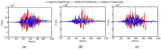 As Figure 15a,b shows, the shear force of the main pier time history curve increases significantly with pounding, and the bending moment time history curve decreases. The shear force time history curve of the IPGM increases obviously in the pulse period, and the pounding has a significant impact on the pulsed ground motions. The internal force of the structure of the IP and NP ground motions is much greater than that of the FFGM, and all three excitation methods show this change. The shear force and bending moment of the main pier bottom of the IPGM (RSN1550) are slightly smaller than those of the NPGMs. This is because the structure response of the IPGM is obvious only in the pulse period.