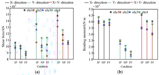 As shown in Figure 5, the internal forces of ele1 and ele4 are similar, and the internal forces of ele2 and ele3 are similar. The internal forces of ele1 and ele4 are larger than those of ele2 and ele3. The internal force of the pier bottom is the largest under IPGMs and smallest under FFGMs. The pier bottom shear force of the CHRF bridges under IPGMs is approximately 1.22–1.58 times larger than that under FFGMs. The bending moment of the pier bottom under IPGMs was approximately 1.17–1.74 times larger than that under FFGMs. The shear force of the pier bottom under NPGMs was approximately 1.17–1.33 times larger than that under FFGMs. The bending moment of the pier bottom under NPGMs was approximately 1.07–1.49 times larger than that under the FFGMs. The results show that IPGMs have a significant effect on the dynamic response of CHRF bridges. In addition, the shear force of the pier bottom under bidirectional excitations was approximately 1.18–1.53 times larger than that under the X-direction excitation. The bending moment of the pier bottom under bidirectional excitations was approximately 1.01–1.18 times larger than that under the Y-direction excitation. Thus, the dynamic response of the pier bottom under bidirectional excitations was significantly larger than that under unidirectional excitations.