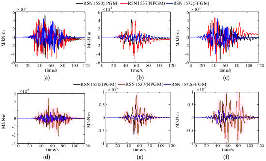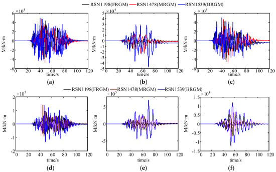 Bending moment time history of tie beam and auxiliary pier; (a) X direction of tie beam; (b) Y direction of tie beam; (c) X + Y direction of tie beam; (d) X direction of auxiliary pier; (e) Y direction of auxiliary pier; and (f) X + Y direction of auxiliary pier.