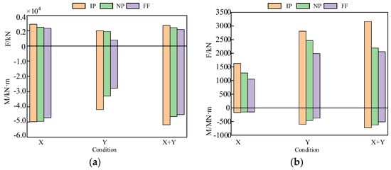 As shown in Figure 7b, under the three excitation conditions, the internal force response change of the auxiliary pier was similar to that of the tie beam. The internal force of IPGMs was the maximum, and the NPGMs’ seismic action was minimized. The auxiliary pier bending moments under IPGMs and NPGMs were about 1.14–1.61 and 1.03–1.23 times larger than that under FFGMs. The auxiliary pier shear force under IPGMs and NPGMs were approximately 1.41–1.54 and 1.07–1.21 times larger than that under FFGMs. The internal force provided by the auxiliary piers under X-direction excitations was minimized, and the laterally fixed bearings could realize the internal force distribution of each pier.