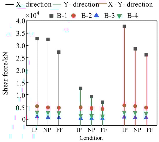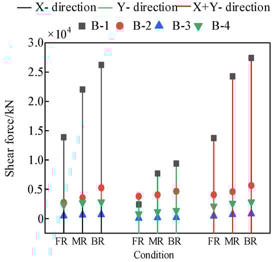 As shown in Figure 13, the shear force of the bearings was the largest under BRGMs. However, the shear force of the bearings was the smallest under FRGMs. Under Y-direction excitation, the shear force of the bearings was the smallest. While the shear force of the bearings under bidirectional excitation was the largest, the dynamic response of the structure was higher. The relationship between the magnitude of the shear force of the B-1–B-4 bearings caused by the directional effect of ground motion was the same as the relationship caused by the pulse effect ground motion.