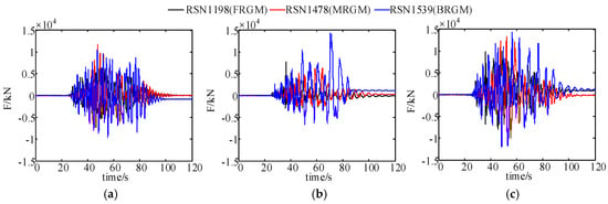 As shown in Figure 11d–f, the bending moment of the auxiliary pier was the largest under BRGM (RSN1539), and the moment of the auxiliary pier was the smallest under FRGMs (RSN1198). Figure 12 shows a comparison of the internal forces of the tie beams and auxiliary piers considering the directional effects of ground motions under the three excitation methods.