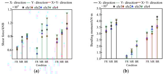As presented in Figure 9, the shear force at the bottom of the main pier was the largest under BRGMs. However, the shear force at the bottom of the main pier was the smallest under FRGMs. The shear force at the bottom of the main pier under two-way excitation was significantly greater than that under one-way excitation. Figure 10 shows a comparison of the shear force and the bending moment at the bottom of the main pier considering the directional effects of ground motions under the three excitation methods.