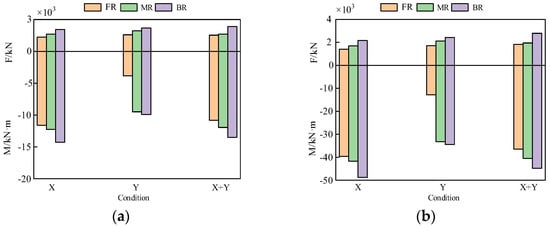 As shown in Figure 10, for the three excitation methods, the internal force at the bottom of the main pier was the largest under BRGMs; however, the internal force at the bottom of the CHRF bridges was the smallest under FRGMs. The pier bottom shear force and bending moment at the pier bottom of the CHRF bridges under MRGMs were approximately 1.36–2.27 and 1.24–2.30 times larger than those under FRGMs. The pier bottom shear force and bending moment of the CHRF bridges under BRGMs were about 1.56–2.53 and 1.32–3.14 times larger than those under FRGMs. BRGMs affect CHRF bridges significantly. In addition, the internal force of the pier bottom of the CHRF bridges under bidirectional excitation is significantly greater than that under unidirectional excitation. The shear force of the pier bottom of the CHRF bridges under bidirectional excitation was approximately 1.34–1.46 times larger than that under the X-direction excitation. BRGMs significantly increase the internal force of CHRF bridges. MRGMs have a greater influence on the internal force of CHRF bridges than FRGMs.