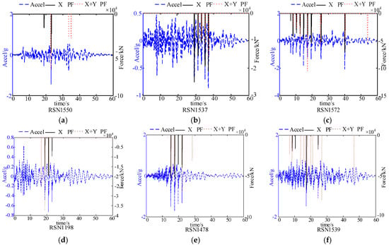Internal force time history of tie beam and auxiliary pier; (a) X direction of tie beam; (b) Y direction of tie beam; (c) X + Y direction of tie beam; (d) X direction of auxiliary pier; (e) Y direction of auxiliary pier; and (f) X + Y direction of auxiliary pier.