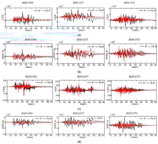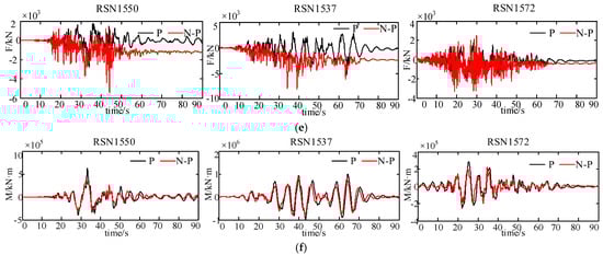 Figure 15 shows the time history curves of the shear and bending moments of the critical section under typical ground motions.
