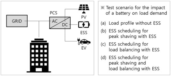 The structure diagram and the scenario of a test system are shown in Figure 2. The system is composed of PV, an ESS, an electric vehicle (EV), a PCS, a building, and a power line from the grid. Electric power is supplied from the grid, PV, ESS, and consumed by a building’s load demand, ESS, and EV. The PCS is the interface between building (as load demand) and PV, the ESS, and EV. The PCS, which is combined with the inverter and converter, is a device for converting AC and DC. The scenarios are conducted with the following methods: (1) without an ESS, (2) only peak shaving with an ESS [10,25], (3) only load balancing with an ESS [20], and (4) peak shaving and load balancing with an ESS.