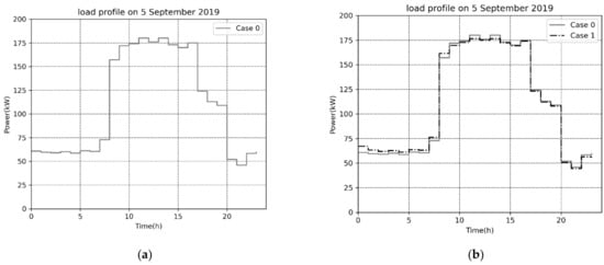 Comparison of load profile on the date the most load demand was used (Case 0: without ESS, Case 1: with ESS): (a) comparison of load profile without ESS; (b) ESS schedule for peak shaving; (c) ESS schedule for load balancing; (d) ESS schedule for peak shaving and load balancing.