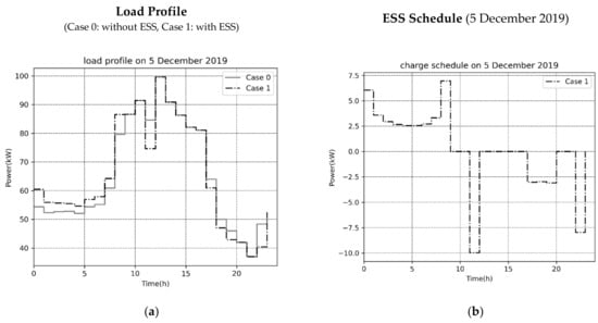Technically, an energy storage system (ESS) is sometimes used to compensate for intermittent power generation outputs, such as solar or wind power. An ESS is also used to improve the overall energy efficiency by charging the energy storage device during a time when the power load is low and discharging the power stored in the device during the peak load time [6,7,8]. From the customer’s point of view, they will be more interested in reducing energy costs, even though ESSs can be used for various purposes [9,10]. Accordingly, we intend to present a solution on how to use ESSs to reduce electricity costs most efficiently. When an ESS is utilized in terms of power load, the ESS must be charged when the load is low (mainly at night), and then, the power charged in the ESS must be discharged when the load is high (mainly during the day) to reduce the peak load. Conversely, in terms of electricity cost, the ESS must be charged during the period of low unit rate (mainly at night) and discharged during the period of high unit rate (mainly during the day) to reduce the electricity cost. Therefore, an efficient method of ESS usage is to apply scheduling for the ESS with the strategy described above.