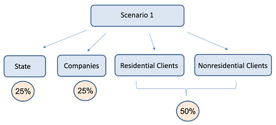 - Scenario 2A solidarity project in which all actors are involved is proposed, that is, the sanitary industrial sector, electricity and pipeline gas and final users, residentials and nonresidential, regulated or not.It is a proposal of progressive characteristics, therefore who has more should give more. It is proposed that the debt is apportioned and adjusted to the real estimated value for 4 years.The total defaulting debt by sector is structured into three large groups: