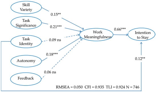 | Model 2: Constrained model | Based on Model 1, but the non-significant pathways of job characteristic variables (skill variety, task significance, autonomy, feedback) on intention to stay were constrained to zero. | 720.805 | 252 | 0.050 | 0.935 | 0.924 | Model 1 vs. Model 2 | 3.494 |