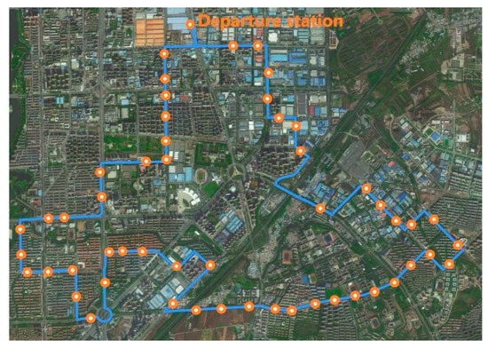 We take an actual circular bus route in Changchun City, China, as an example to verify and analyze the model. The mileage of the route is = 28 km, passing through 53 stations, as shown in Figure 2. The departure times of the first and last trips daily are 5:50 a.m. and 7:00 p.m., respectively. There are I = 68 service trips during the daily operation. The departure timetable of the route is shown in Table 1. Assuming that there is a depot 5 km away from the departure station of the route, where the bus can dwell and be charged, = = 5 km.