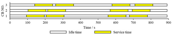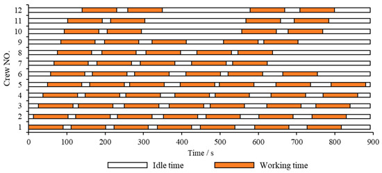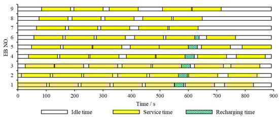 The departure time of the first bus is recorded as 0 s, and the end time of the last bus is recorded as 892s. The vehicle and charging scheme of EBs within the all-day operating hours (0–892 s) are shown in Figure 3, the vehicle-scheduling scheme of CBs is shown in Figure 4, and the crew-scheduling scheme is shown in Figure 5. In the Gantt charts below, white represents the idle time of the bus or driver, yellow indicates the service time of the mixed fleet on the route, green slashes are the charging time of EB, and orange shows the driver’s working time.