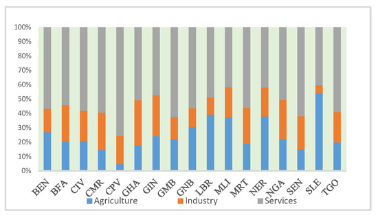 Against the backdrop of the new trade model of “African sectoral trade” for national economic and social development, Africa has further expanded its foreign trade not only to the Western world but also to its neighboring regions. In the present day, the exports of West Africa come mainly from the exploitation of oil in various countries. It ranks as the third largest crude oil-exporting region following Saudi Arabia and Russia. Crude oil exports of ECONWAS accounted for 6.5% of the world’s total in 2020. In the meantime, the import of refined oil products is about 5 times more than exports. The share of primary, secondary and tertiary sectors in the West African region is 22.57%, 24.99% and 51.91% in 2020, as shown in Figure 1 and Figure 2.