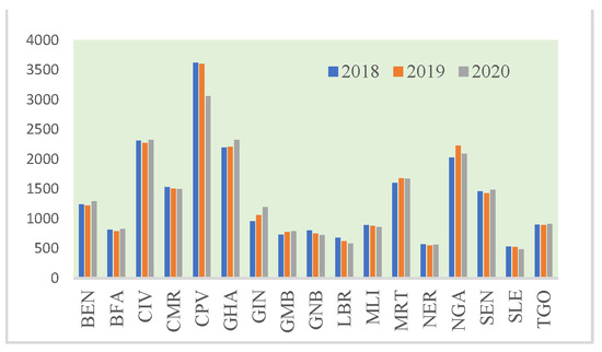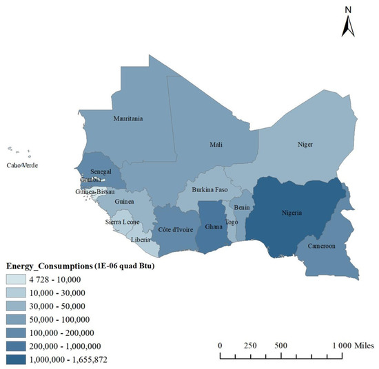 The relationship among energy consumption, trade development, and economic growth has been a popular topic in the academic sphere. The relationship among these three has generated a great deal of research interest. However, few empirical studies have attempted to examine the causal relationship among energy, trade, and economy at the country level in the West African region. Another fact that should not be overlooked is that there are significant differences in the level of economic development among the countries in the West African region.However, most previous studies have ignored the uneven economic development in Africa [4,5,6]. Taking the per capita USD 1000 as the limit, this paper divides the countries in West Africa region into two groups. Benin (BEN), Cote d’Ivoire (CIV), Cameroon (CMR), Cabo Verde (CPV), Ghana (GHA), Mauritania (MRT), Nigeria (NGA), and Senegal (SEN) belonging to the group with high economic development, which contribute 75.28% and 63.48% to total energy consumption and total trade, respectively. Burkina Faso (BFA), Gambia (GMB), Guinea-Bissau (GNB), Mali (MLI), Niger (NER), Sierra Leone (SLE), and Togo (TGO) belong to the group with a lower level of economic development, which contribute 24.72% and 36.52% to total energy consumption and total trade, respectively.