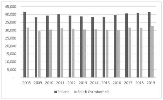 Most of the workforce consists of lower-level employees and manual workers. The employment rate in South Ostrobothnia was 76% in 2020 and the unemployment rate 5.6%. In addition, household disposable income in South Ostrobothnia was 20,548 euros per capita, which was 2100 euros less than in the whole country. Lastly, as indicated in Figure 1, the regional per capita GDP was 32,655 euros in 2019, while the national figure was 41,632 euros [58,67].