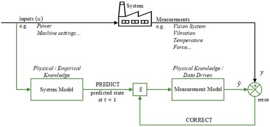 Sustainable manufacturing is currently a very significant principle that industries must adopt due to many factors driven by environmental issues, including more stringent legislation, higher energy costs, and consumer preference for environmentally benign products and services [1]. Manufacturing processes have a direct impact on the consumption of natural resources and their resultant emissions [2]. The emergence of Industry 4.0 provides significant opportunities for the development of intelligent manufacturing environments that have greater production flexibility and resource efficiency [3]. The deployment of sensors, Internet of Things (IoT), and Cyber-Physical Systems (CPS) within manufacturing is predicted to contribute to addressing some of the global challenges with respect to resource and energy efficiency [4]. Greater sensorisation of manufacturing processes is a central pillar of the Industry 4.0 concept and is critical to improving resource efficiency and sustainability. The ability to monitor key process variables in real-time enables a tight control of processes to avoid defects; eliminates waste of raw materials and energy in producing scrap; prevents harmful environmental emissions; and facilitates processing of more sustainable but difficult to process raw materials such as recyclates. However, it is not always feasible to physically measure critical variables in real-time due to, e.g., a lack of an available sensor technology, lack of sensor accessibility, high cost, poor accuracy, high latency, etc. In this case, concepts such as soft sensing and data and sensor fusion may provide a solution, enabling the variable(s) of interest to be inferred from available information in a connected cyber-physical system. Often, this may be achieved by using purely data-based approaches via Machine Learning; however, this will often require a large amount of historical training data, high computational resources for model training, and typically results in models that do not generalise well to different systems/raw materials and which may exhibit poor long-term robustness. An alternative in some situations is to use an observer-based state estimation method, whereby the future value of the system states is predicted based on the current value according to some model of the system. Then, in the next time step, the estimate is updated with measurement data available from the system—which may be indirectly related to the variables of interest and/or of limited reliability. This ‘predict-correct’ structure, as illustrated in Figure 1, exploits an often approximate, physical model of the system to derive an algorithm which provides sufficiently accurate and fast estimates with limited need for training data and with good robustness to variations in the process over time.