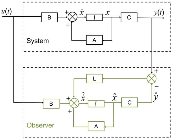 where is the predicted measurement vector (obtained by substituting into the measurement equation (Equation (5)). The Kalman gain matrix K is designed to minimise posterior error covariance . If the process noise is low, the predicted measurement is trusted more than the actual measurements. However, if the measurement noise is low, then the predicted measurement will be more heavily corrected. The Kalman estimator equation (Equation (7)) has a similar ‘predict-correct’ structure relative to the Luenberger observer estimation equation (Equation (2)). However, the KF has functions beyond the observation of unmeasured states as it also allows for the optimal fusion of multiple sources of measurement data according to their uncertainty.