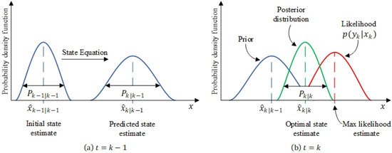 The concept is illustrated with a simple one-dimensional example in Figure 3. The previous estimate of the state variables, (i.e., the estimate of x at sample given all the information up to and including sample ), and its covariance is propagated through state Equation (5) to produce (i.e., the estimate of x at sample k given all the information up to and including sample ). This step is sometimes referred to as the ‘time update’. Estimate has a larger covariance as more uncertainty is introduced due to the process noise term in the state equation. This estimate is the prior distribution at sample k. The new measurement data y at sample k yields the likelihood function . The optimal (minimum variance) estimate of x at sample k is then determined by combining the prior and the likelihood in the ‘measurement update’ step.