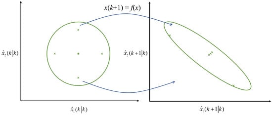 Two-dimensional illustration of the unscented transform to estimate the mean and covariance of state estimates in the UKF ‘time update’. Sigma points are generated from the noise distribution following the last measurement update and propagated through the nonlinear state equation . The mean and covariance of the state estimates are estimated by a weighted sum of the sigma points following the nonlinear transformation.