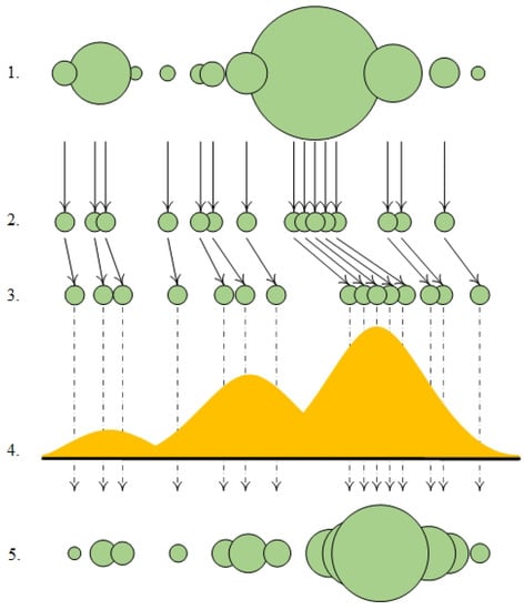The particle filter was developed to deal with systems having multi-modal probability distributions, i.e., as opposed to the estimates having a normal (Gaussian) probability distribution, and there may be a distribution with more than one peak [25,26,27]. In navigation problems, where the technique emerged, this would arise where there may be more than one likely map location for a target vehicle based on the information available. In this scenario, a numerical approximation of the distribution which can be propagated through the prediction and correction recursions is needed. This can be performed by representing the probability distribution of the state estimates as a set of samples or ‘particles’ via Monte Carlo methods (repeated random sampling). Figure 5 illustrates the principles of the particle filter in five general stages, which can be described as follows: