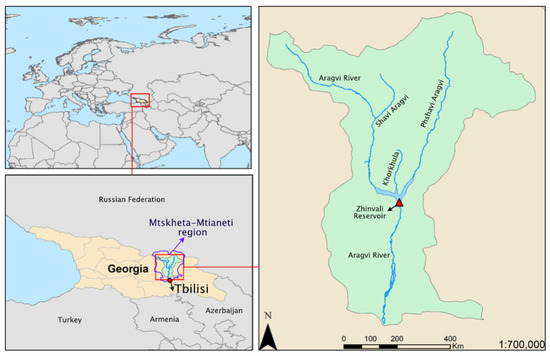 Currently, the hydropower sector is the largest water user in the country. The Aragvi River is intensively used for hydropower production, and it stands out in terms of capacity, with an annual potential capacity of 0.5 million kilowatts. Due to the river-bed inclination, the Aragvi River has high energy potential. The Aragvi River Basin is one of the premier rivers intensively used for power generation today in Georgia and is scheduled to launch more hydropower plants (HPP) in the future [10]. At present, there are two large operating HPPs in the river basin, Zhinvali HPP and Aragvi HPP, with total installed capacities of 138.5 MW and annual capacities of 447 GWh [11]. The Zhinvali HPP complex includes the Zhinvali reservoir (storage capacity of 520 million m3) and the forebay Bodorna reservoir (storage capacity of 1 million m3), which regulate the outflows from Zhinvali.