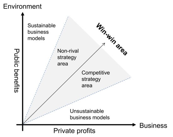 Despite the empirical evidence supporting Porter’s hypothesis, we do not observe that the global markets are shifting to green, sustainable economies yet. Researchers tried to gain a better understanding of the drivers behind the mechanism. According to Orsato et al. [2], successful sustainability strategies take place in a certain win–win area on the public benefits vs. private profits plane. Only a few actions of corporate environmentalism will generate economic returns, and this is most likely to happen in win–win areas with low competition with existing products/technologies, as shown in Figure 1.