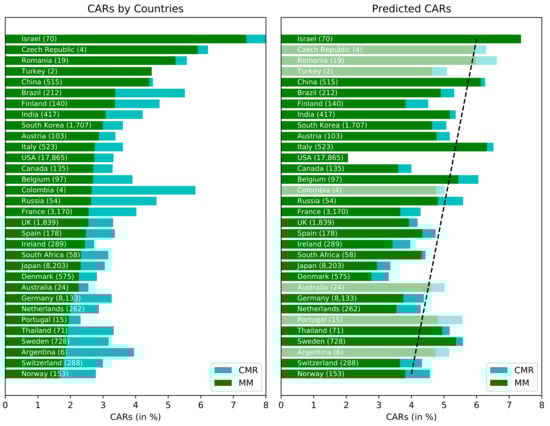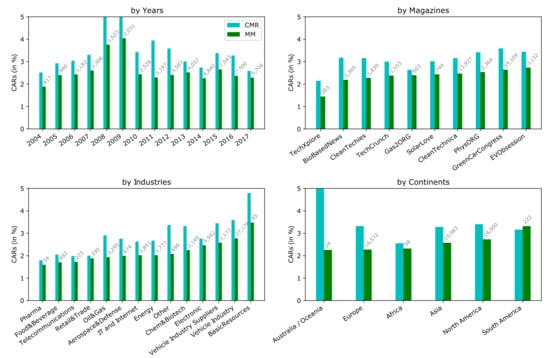 Table A1 summarizes our descriptive statistics for the dependent and independent variables. Figure 3 describes the dependent variable (CAR) by industries, continents, years, and magazines. The CARs based on the CMR and MM models correlate and resemble highly with each other. The CMR estimates provide higher values than the MM estimates, as previously observed in [66] and shown by differences in arithmetic mean and standard deviation in Table A1. The breakdown by years reveals a stable average CAR of around 2.25% during the observation period, which indicates that possible relationships can be analyzed without any long-term trends that have to be taken into account. The breakdown by magazines reveals that there is no bias caused by the magazines as CARs are almost equally high. The lower two breakdowns reveal specific differences between continents and industries. On the one hand, North and South American green activities by listed companies seem to be slightly more successful than European and Australian ones. These differences are, however, small. On the other hand, differences between industries are larger and especially the vehicle and basic resources industry seem most successful. The high variance inflation factors (see VIF in Table A1) of the dependent variables with values far above 1.0 express that the independent variables intercorrelate strongly and indicate multicollinearity problems.